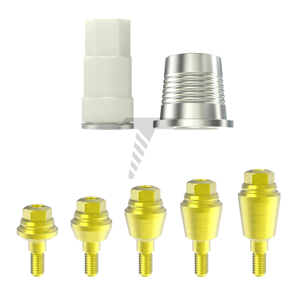 Our complete prosthetic set for digital screw retained restorations on 1.4 multi unit platforms. The set includes a Straight Multi Unit 1.4 Abutment, a matching Titanium Base, and a PEEK Scan Body for full CAD/CAM workflow integration.